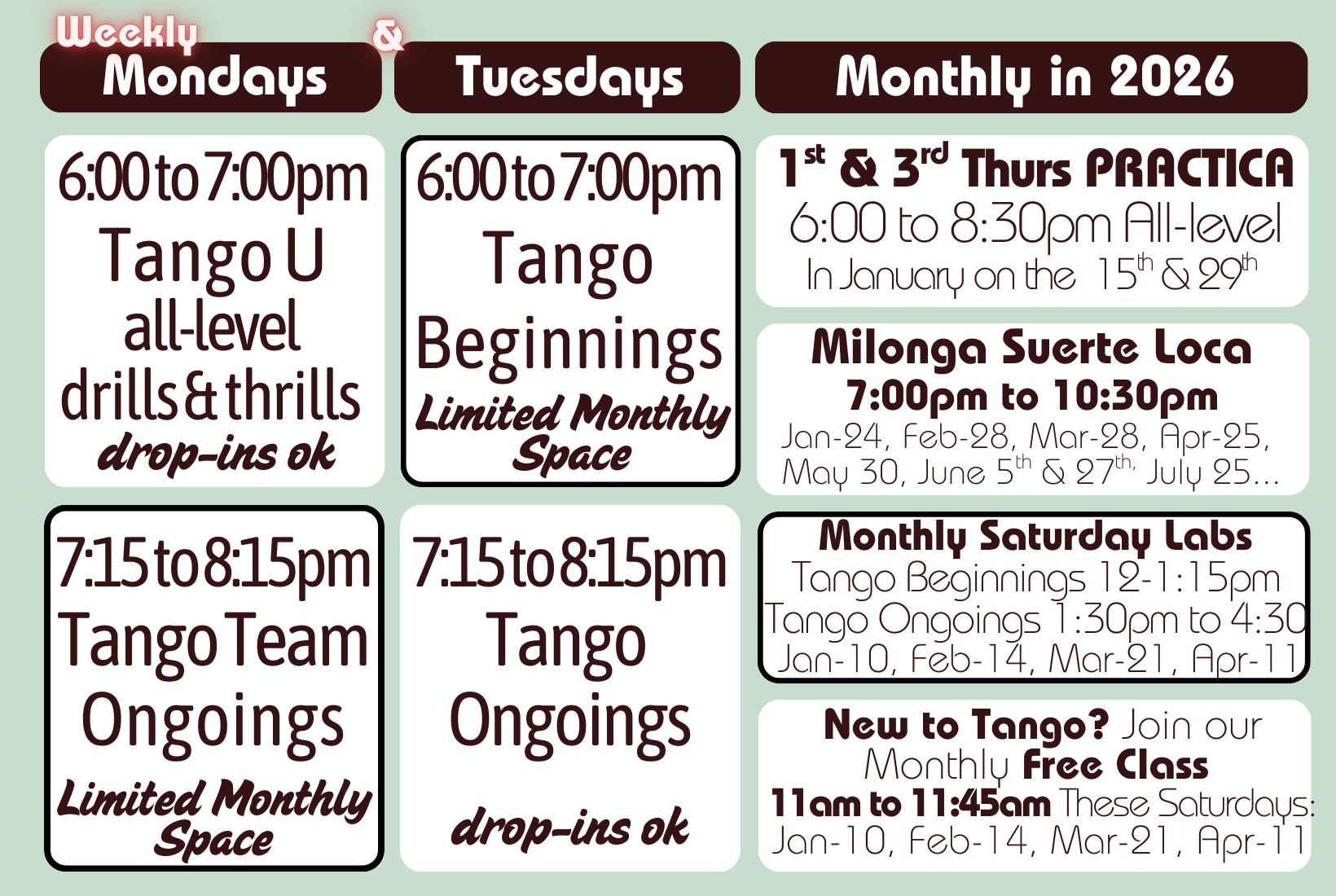 * in 2026 4 weekly classes Mondays & Tuesdays (calendar below search: “class” and either “Monday” or “Tuesday” or “Begin”