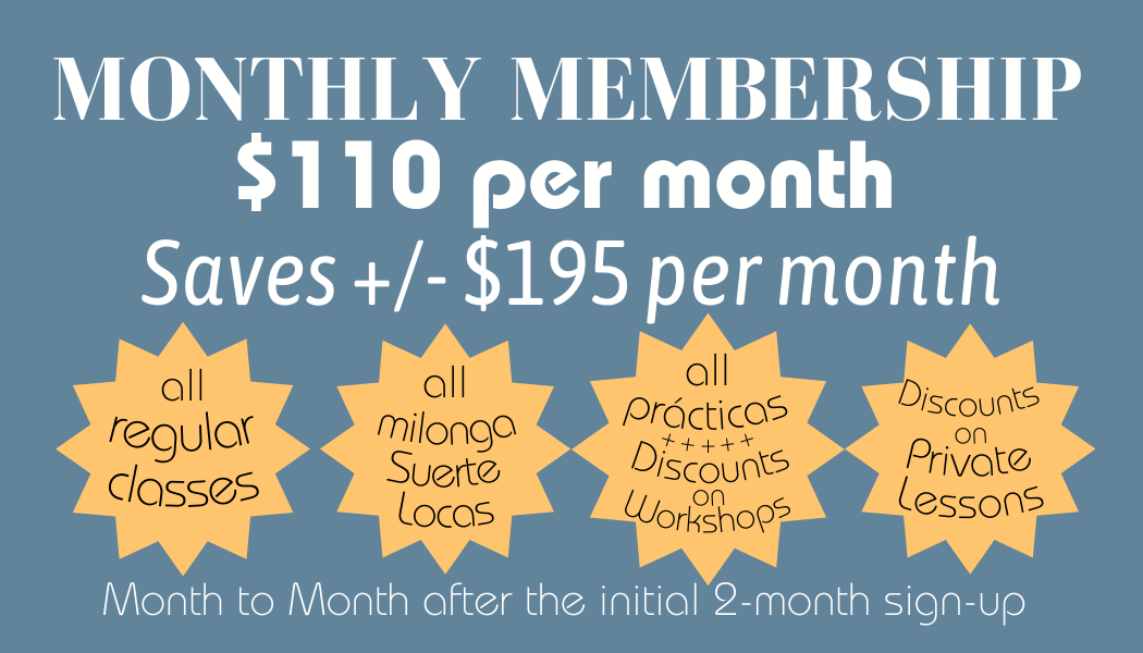 $110/month Monthly Membership saves roughly $175 a month ($6.50 - $12.22 per class). 2 month minimum. Access to any regular class, practica, milonga. (Cash, Venmo, Zelle or best monthly recurring electronic)